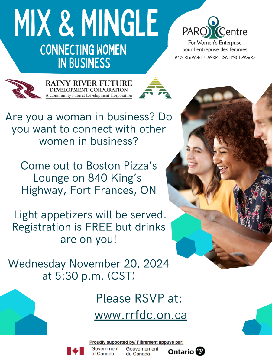 Please join Rainy River Future Development Corporation and PARO Centre for Women's Enterprise to learn more about how these organizations can help in your business journey. As well as a chance to meet and connect with other female business owners.